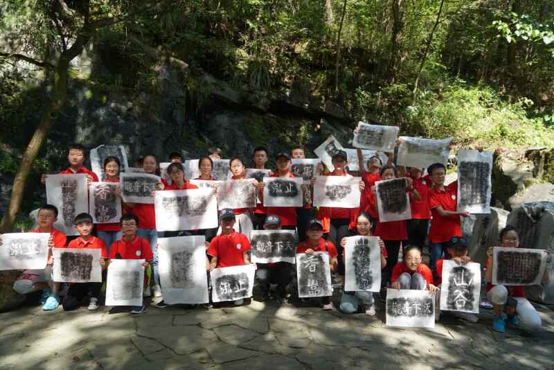 “窮幽深而不盡,坐石上以忘歸”是北宋文學(xué)家王安石用以形容山谷流泉美景的經(jīng)典詩(shī)句。在這里,營(yíng)員們不僅體驗(yàn)到青山綠水木橋溪流構(gòu)成的靜謐之美,還感受到了石刻上的文化與藝術(shù):在長(zhǎng)達(dá)1500余米的山谷兩岸的石壁上,自唐代至今留存的名家文人石刻將近400方,琳瑯滿目,美不勝收。走在歷代書法藝術(shù)長(zhǎng)廊之中,仿佛再現(xiàn)了古代文人墨客徜徉于此,物我兩忘,題辭勒石的場(chǎng)景……營(yíng)員們還合作體驗(yàn)了拓片的制作,在鍛煉動(dòng)手能力的同時(shí)親近了中國(guó)傳統(tǒng)文化,感受了中國(guó)書法魅力。